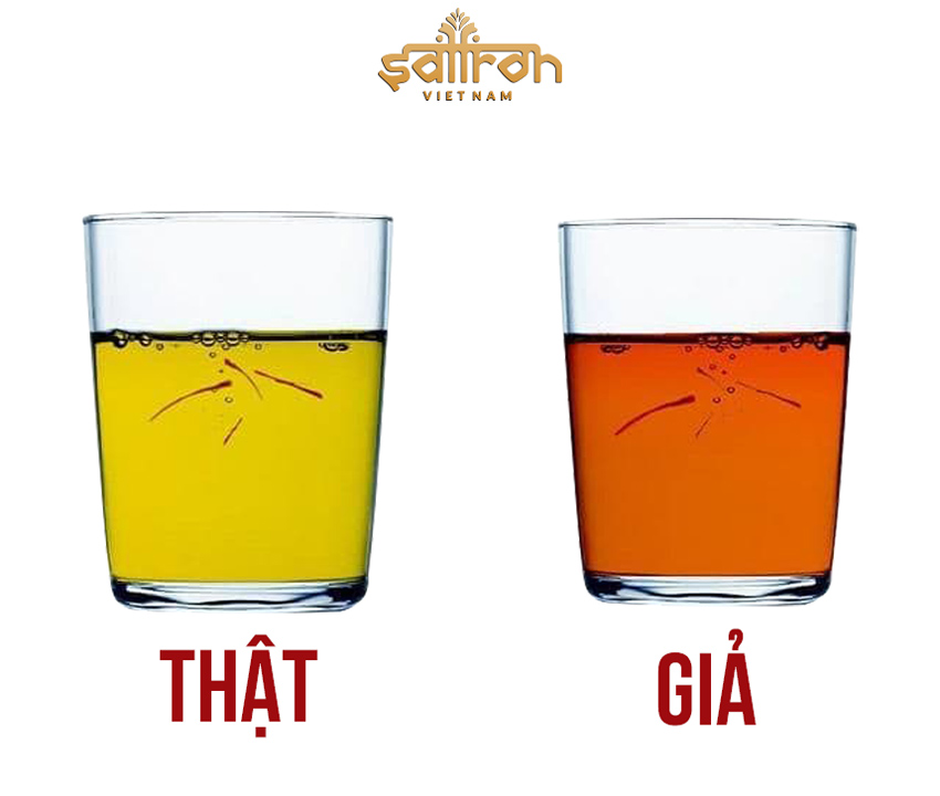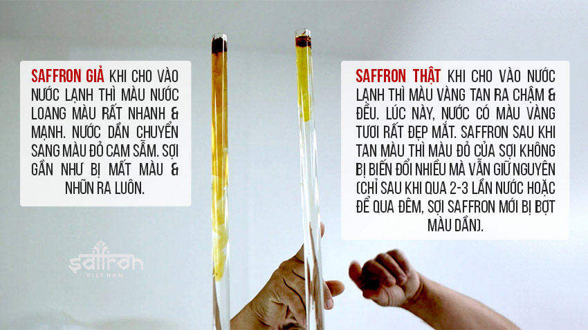 Nếu là sợi thật, nước tan ra có màu vàng óng. Nếu loại giả sẽ cho màu cam đỏ. Tuy nhiên, cách làm không phải lúc nào cũng cho kết quả một cách tuyệt đối, nhất là thủ đoạn làm giả saffron đang ngày càng tinh vi hơn.