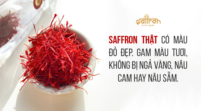 Saffron thật có màu đỏ đẹp. Tuy nhiên tùy vào từng loại saffron mà gam màu đỏ này sẽ thiên đỏ sáng hoặc đỏ sẫm khác nhau. Ngược lại saffron giả thường có màu đỏ cam xỉn, nâu cam hay nâu sẫm đen.