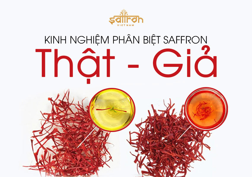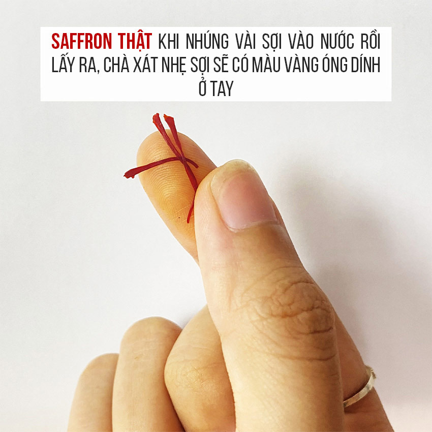 Saffron thường bị làm giả bằng râu ngô, sợi thịt bò (lợn) khô,….xé nhỏ ra rồi tẩm ướp màu & mùi. Do đó khi cầm lên tay, màu đỏ ngay lập tức dây ra tay rất nhiều, màu cam đỏ sẫm. Ngược lại saffron thật thì màu khó dính ra ngón tay hơn. Phải chà xát nhẹ hoặc nhúng sợi saffron qua nước cho ẩm thì mới thấy màu vàng nhạt dính ra tay được.