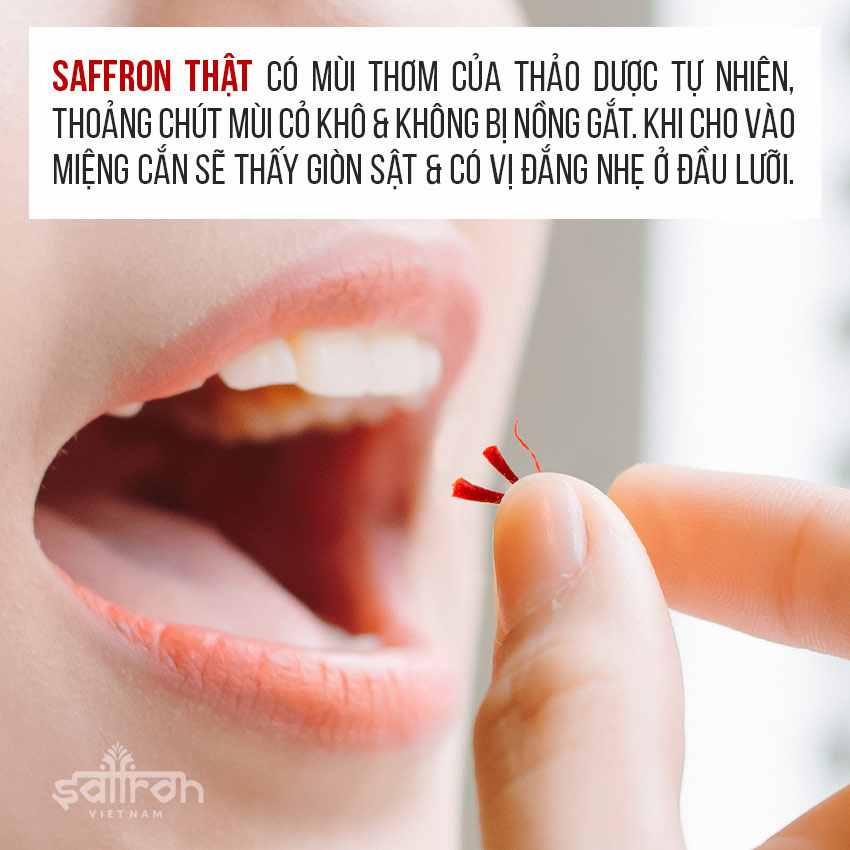 Một điểm cực kỳ đặc biệt nữa là saffron có chứa hoạt chất Picrocrocin, do đó chúng sẽ có vị đắng nhẹ. Do đó khi cho một vài sợi saffron vào miệng nếm thử, nếu là sợi thật sẽ cảm nhận được vị đắng nhẹ ở đầu lưỡi. Saffron giả thì không có vị này. Tuy nhiên vị đắng của saffron chỉ rất nhẹ thôi nên lúc dùng saffron pha với nước thì gần như nước không hề bị đắng hay khó uống.