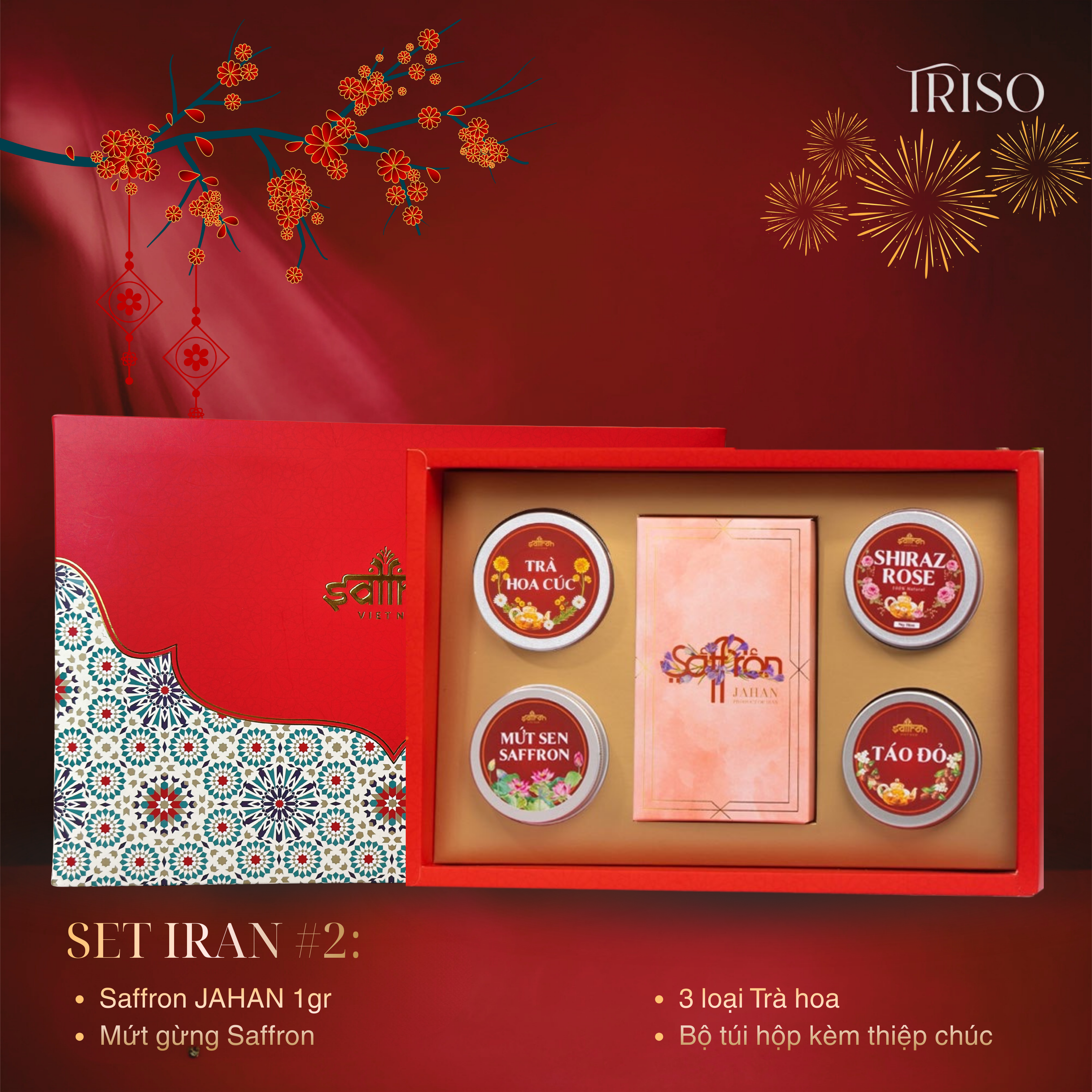 Khác với các món quà được sản xuất đại trà trên thị trường, hộp quà Tết từ Saffron VIETNAM được đặt thiết kế & sản xuất riêng, với gam đỏ rực rỡ của ngày tết kết hợp cùng hoa tiết Ba Tư độc đáo thú vị. Bên trong là khay lót được làm từ giấy cứng cao cấp cùng màu vàng nhũ đồng sang trọng. Ngoài ra còn có thêm túi đựng đi kèm. Không những lịch sự, tinh tế, sang trọng mà còn đậm chất tết.