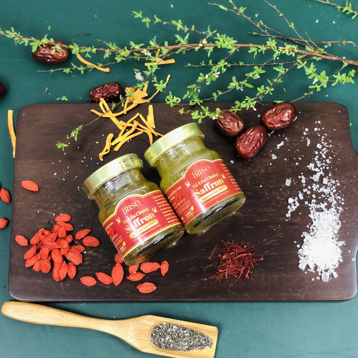 👉Thành phần: 25% Tổ yến nguyên chất, đường phèn, đông trùng hạ thảo, saffron