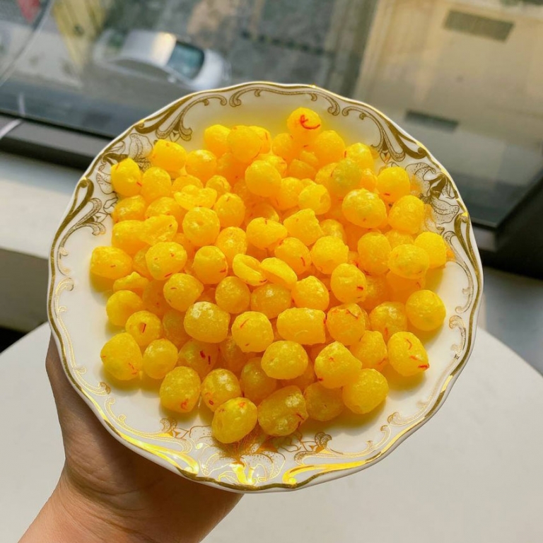 Mứt sen kết hợp cùng thảo mộc saffron tạo nên hương vị độc đáo, và những hạt mứt căng tròn, vàng óng rực rỡ.