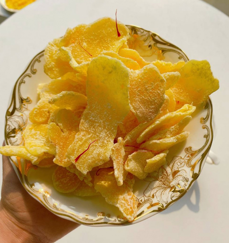 Những lát gừng có vị cay ấm được bọc một lớp đường phấn mịn ngọt ngào và vị thảo mộc tinh tế của Saffron, hương vị rất độc đáo.