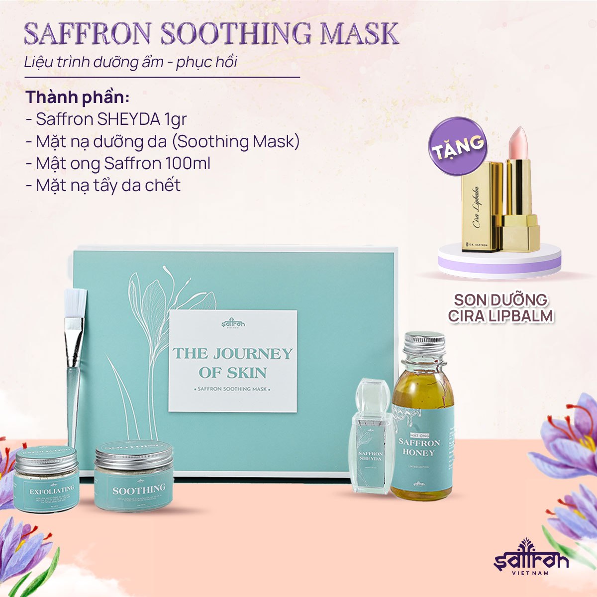 Bộ sản phẩm Saffron Soothing là liệu trình phục hồi và trị mụn cho làn da từ trong ra ngoài, có thể kết hợp cả uống và đắp mặt nạ. Saffron Soothing mask là dòng mặt nạ với chiết xuất thiên nhiên từ rau diếp cá, rau má rất an toàn lành tính cùng thành phần dược mỹ phẩm bùn khoáng Bentonite giúp giảm dầu thừa và bã nhờn bít tắc, làm thông thoáng lỗ chân lông, cải thiện nhanh tình trạng mụn, làm dịu vết đỏ, mang lại làn da sạch mụn và mịn màng.